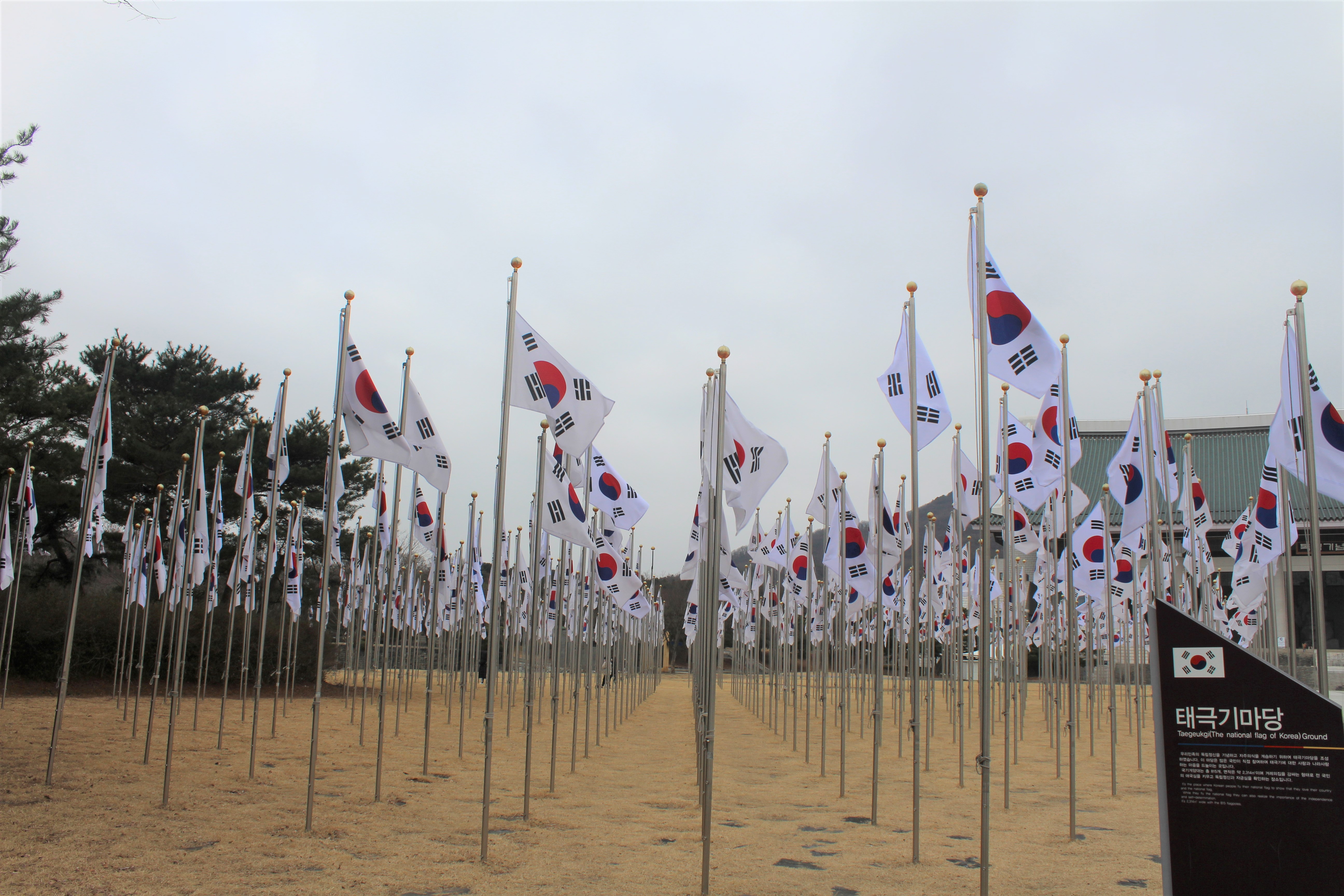 겨레의탑을 지나 조금 더 걸어가다 보면 독립기념관의 또 다른 상징인 '겨레의집'이 보입니다. 특유의 아름다움과 웅장함을 자랑하는 겨레의집은 수덕사 대웅전을 본떠 건축한 동양 최대 규모의 기와집인데요. 겨레의집 앞에는 푸른 자연에 둘러싸인 '태극기마당'이 있기에 매년 많은 방문객들이 태극기와 겨레의집을 배경으로 아름다운 사진을 남기곤 합니다.