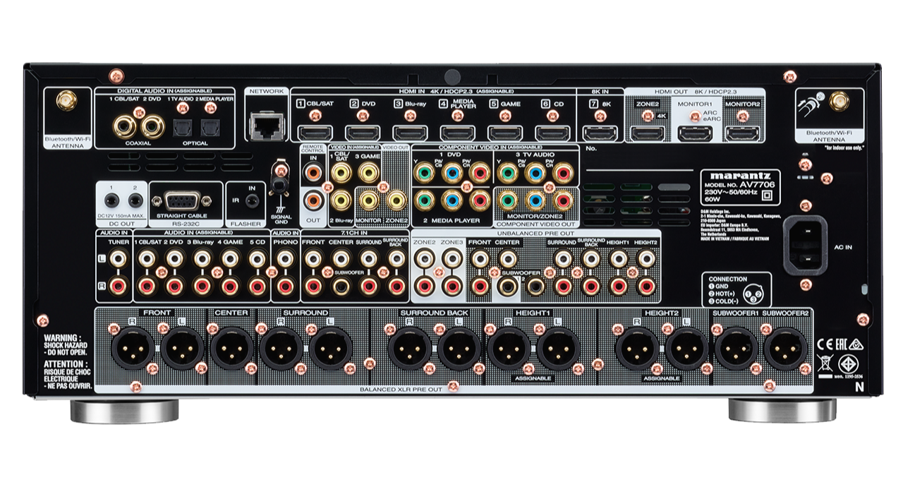 수십 년에 걸친 오디오 기술의 마란츠 AV 프로세서 AV7706은 Hi-Fi 애호가를 위한 프리미엄 사운드를 자랑합니다. 최대 11.2채널의 AV7706은 11개의 스피커와 2개의 서브우퍼까지 지원하며, 모든 음역대에서의 안정적인 사운드를 위해 두 개의 서브우퍼 출력이 저주파를 고르게 감쇄합니다.
