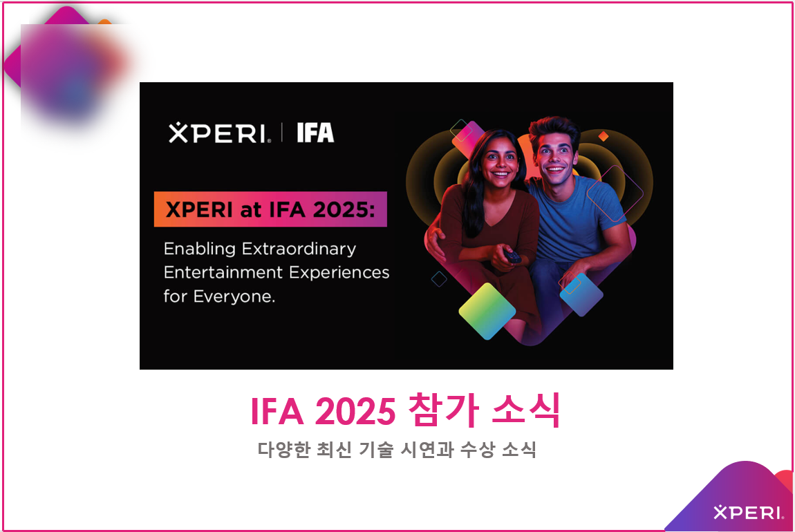 매년 9월, 전 세계 기업들이 독일 베를린에서 열리는 IFA 2025에 모여 최신 가전제품을 선보입니다. 올해 IFA에서는 AI, 스마트 홈 기술, 지속 가능하고 친환경적인 솔루션, 그리고 디지털 엔터테인먼트 분야의 흥미로운 혁신을 엿볼 수 있었는데요. 저희 Xperi도 IFA 2025에 참가해 TiVo, DTS, IMAX Enhanced 등 특별한 엔터테인먼트 경험을 위한 여러 브랜드의 기술을 선보였습니다.